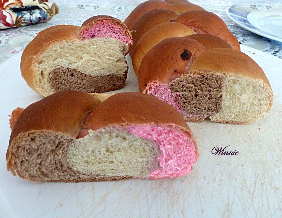 Winnie this tri colored bread is so fun! Here in America we call ice cream with chocolate, strawberry, and vanilla all mixed Neopolitan. That's what this bread reminds me of. Thanks for sharing with SYC