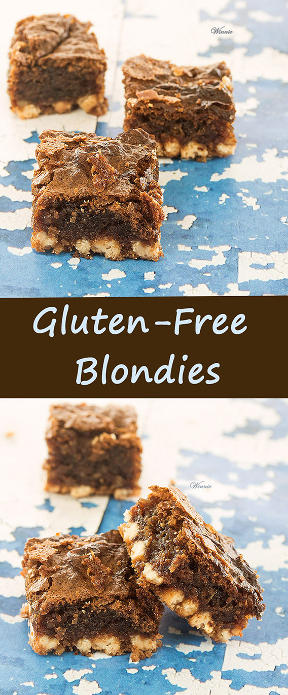 Gluten-free, dairy-free Blondies, made with potato-flour and ground almonds. Moist and soft from the inside, with crispy top layer.